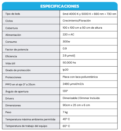 Con una innovadora placa de LEDs dispuestos en forma logarítmica, el Q300 reduce las variaciones de luz entre el centro y los bordes, logrando una distribución homogénea e ideal para todo el ciclo de la planta. Diseñado para uso profesional, esta versión lleva la tecnología Quantum a su máxima expresión. Incorpora LEDs Samsung 2835 de 4000 K y 5000 K, rojo 660 nm y rojo lejano 730 nm, ofreciendo un espectro completo para resultados de calidad superior.